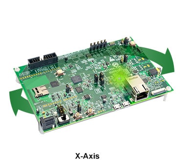 MIMXRT1050-EVK/EVKBには、オンボード加速度センサを利用した「水準器」のデモが搭載されています。ボードが水平の場合、緑色LEDはオフのままです。ボードが傾いている場合、X軸の傾きに応じて緑色のLEDが徐々に点灯します。