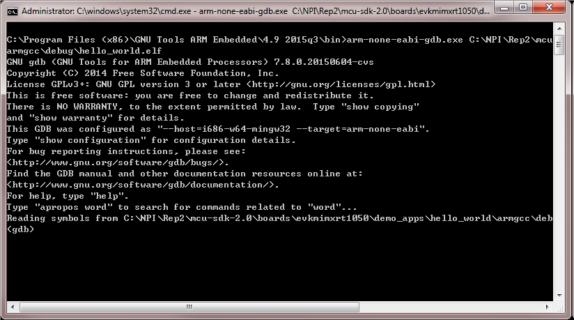 “arm-none-eabi-gdb.exe .elf”. For this example, it is “arm-none-eabi-gdb.exe hello_world.elf”.