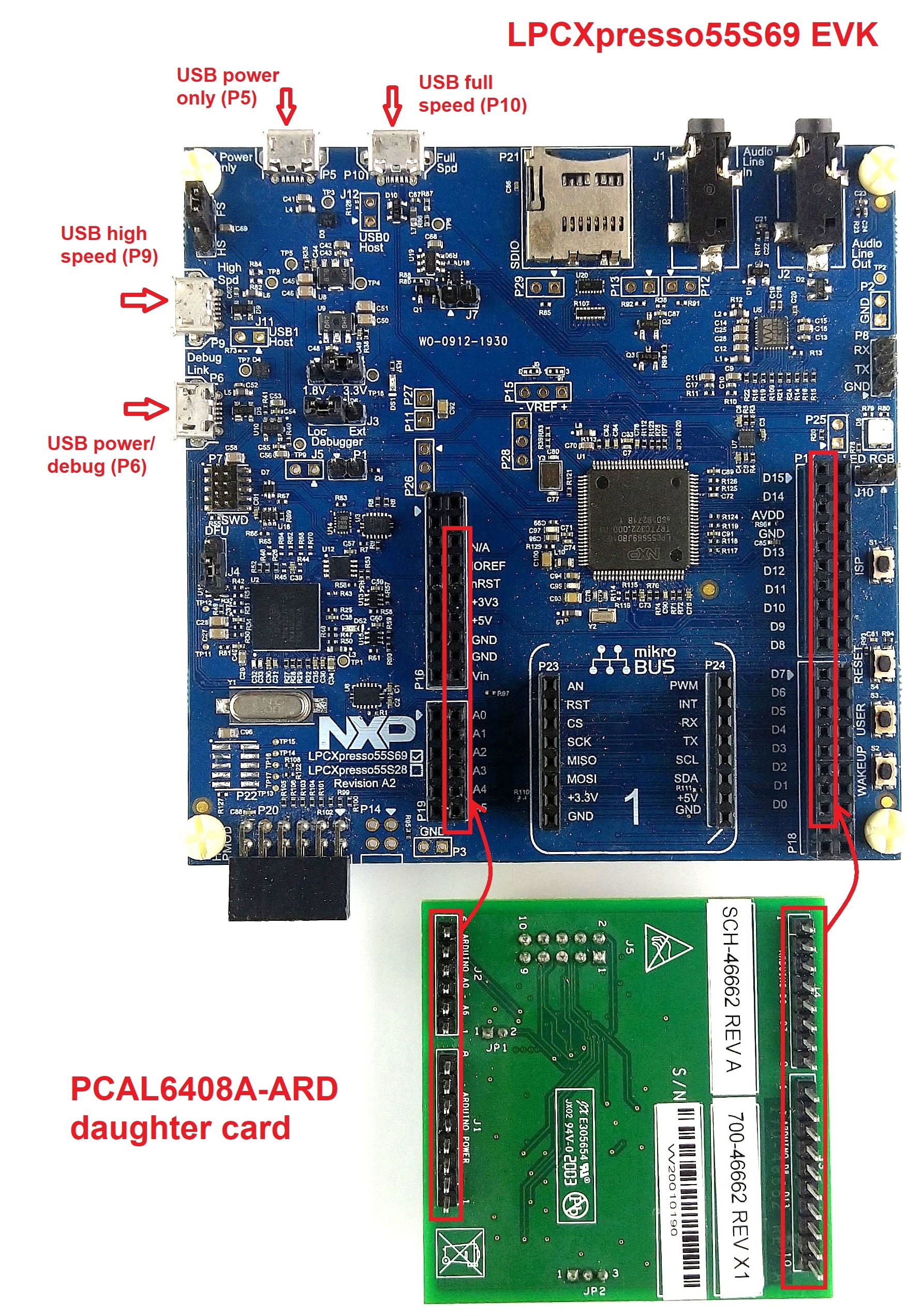 図3は、PCAL6408A-ARDおよびLPCXpresso55S69 EVKボードの動作に必要なハードウェアを示しています。以下の内容で構成されます。