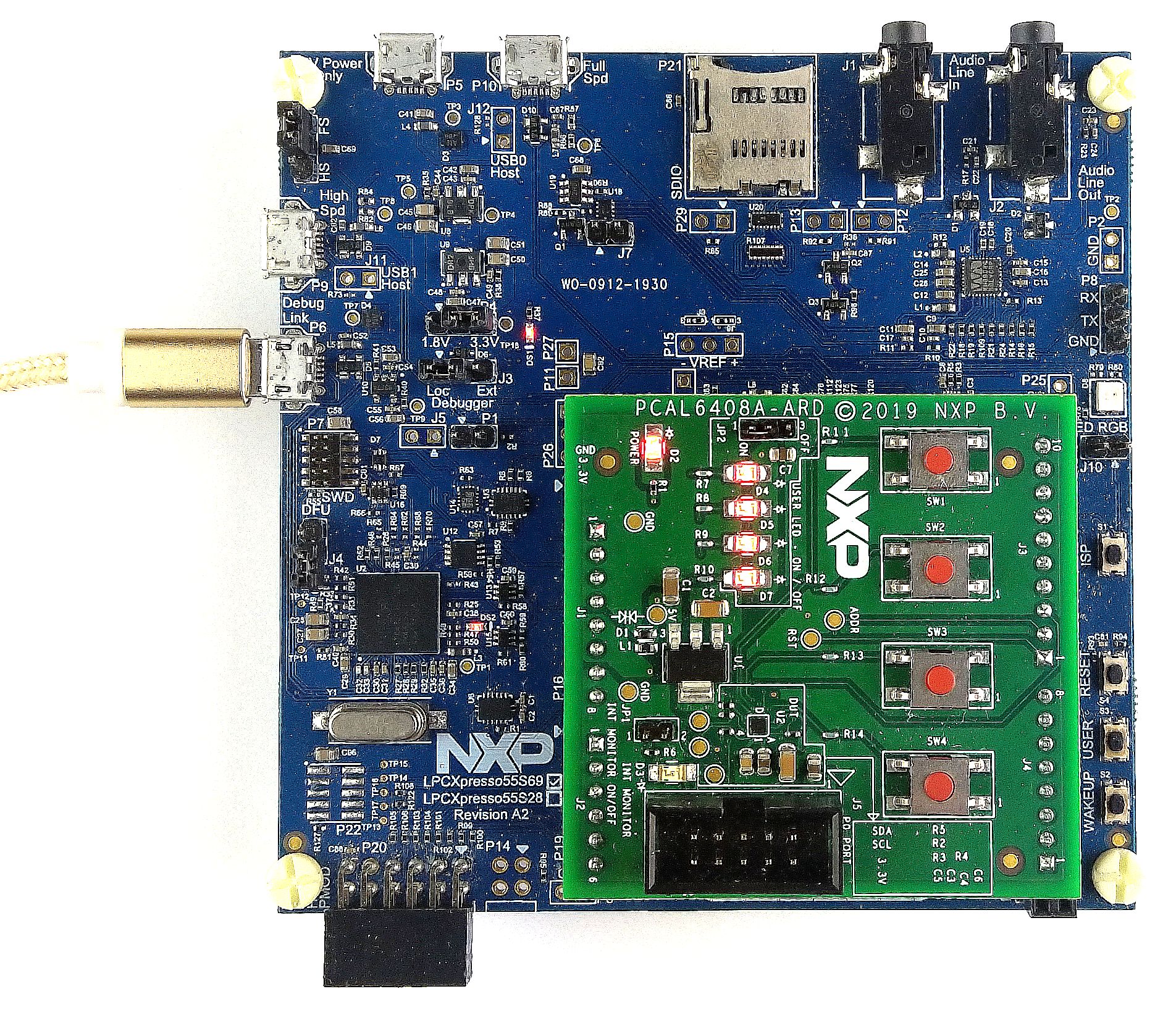 図3. PCAL6408A-ARDドータ・ボードおよびLPCXpresso55S69マザー・ボード(起動前)