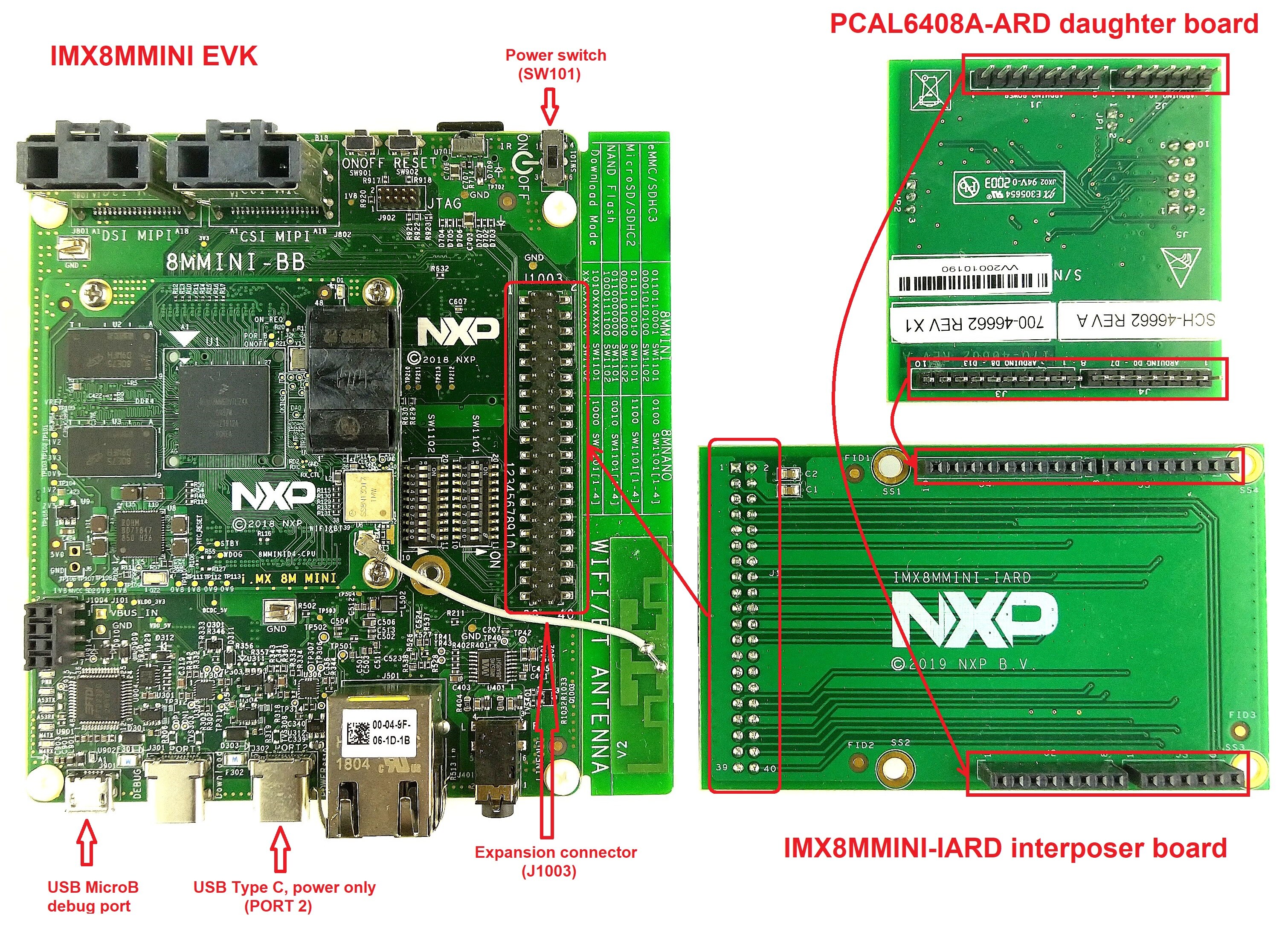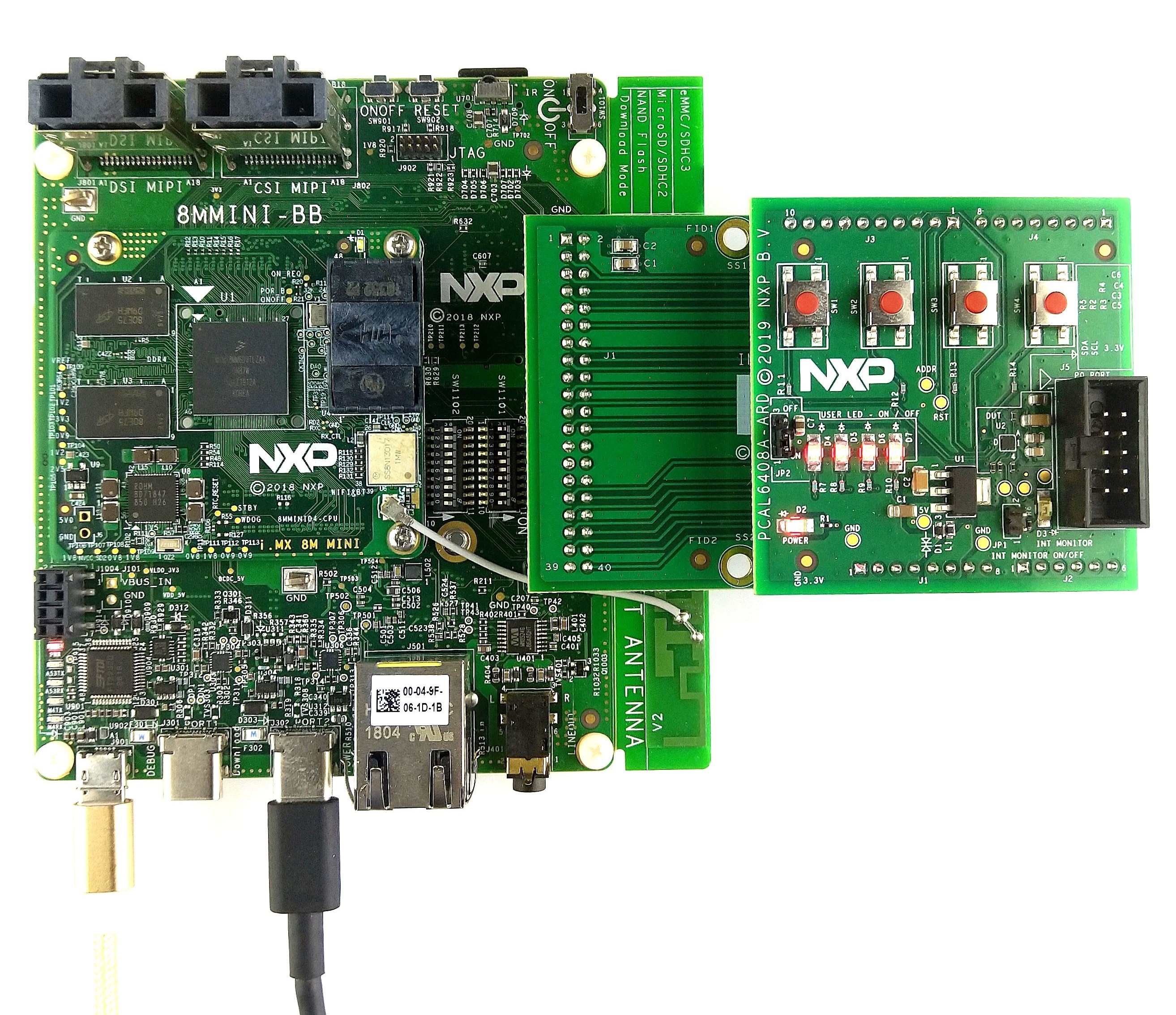 図5. PCAL6408A-ARDドータ・ボード、IMX8MMINI-IARDインターポーザ・ボード、i.MX 8M Mini LPDDR4 EVKのアセンブリ(起動前)