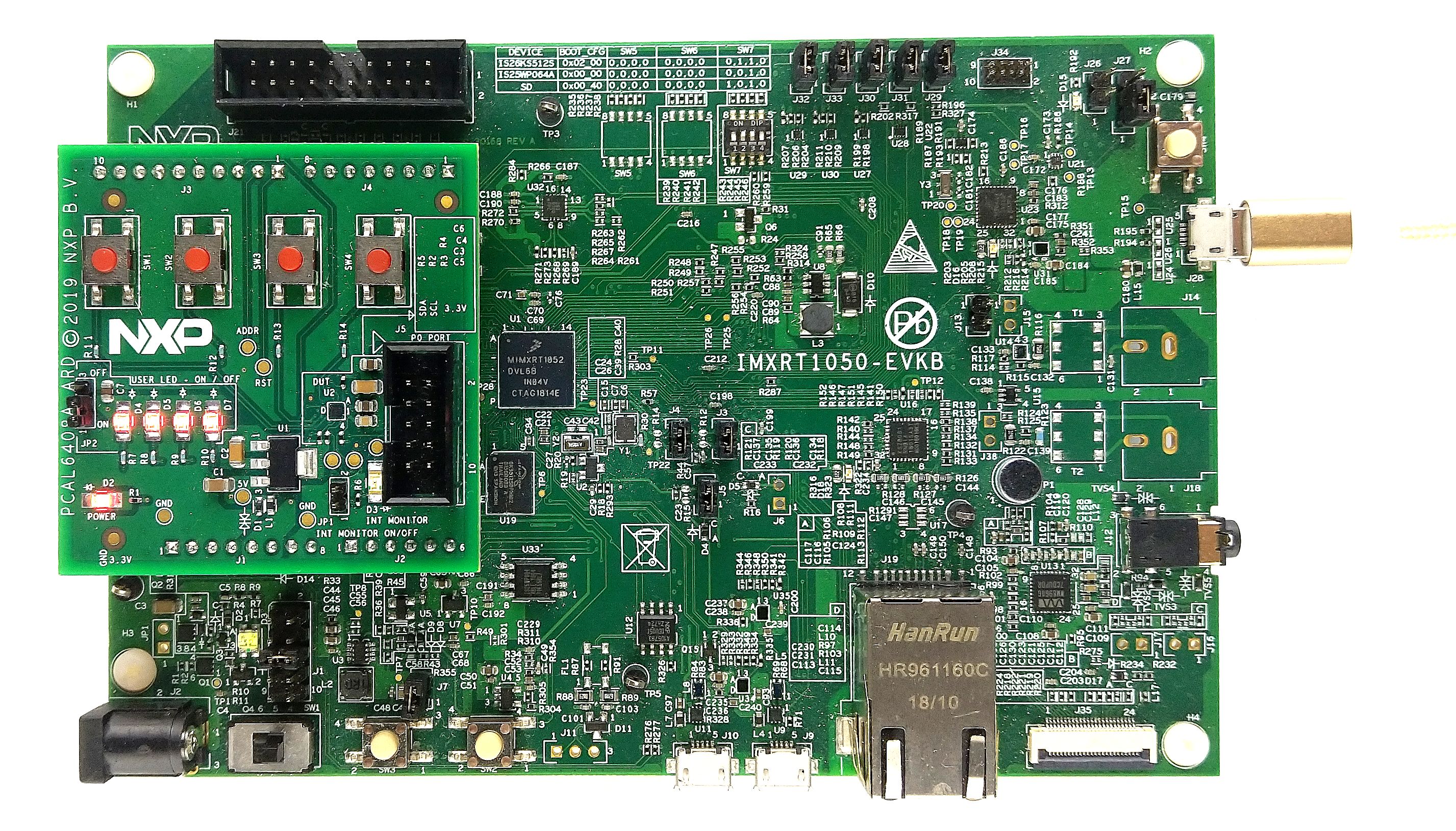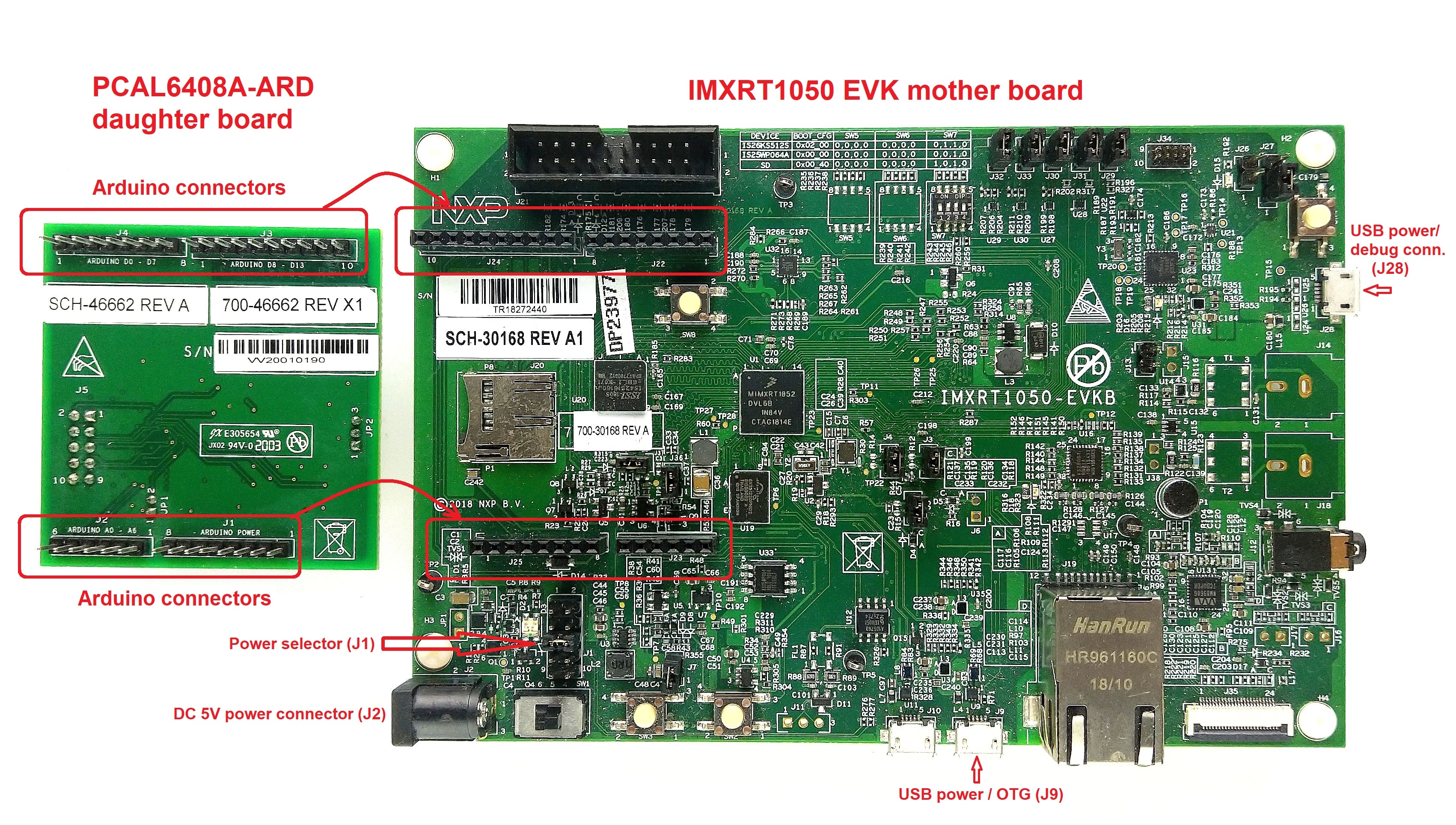 図1. PCAL6408A-ARDドータ・ボードおよびIMXRT1050 EVKボード(起動前)