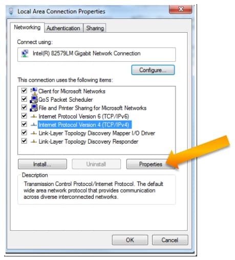 [インターネット プロトコル バージョン 4 (TCP/IPv4)]オプションを選択し、[プロパティ]をクリックします。