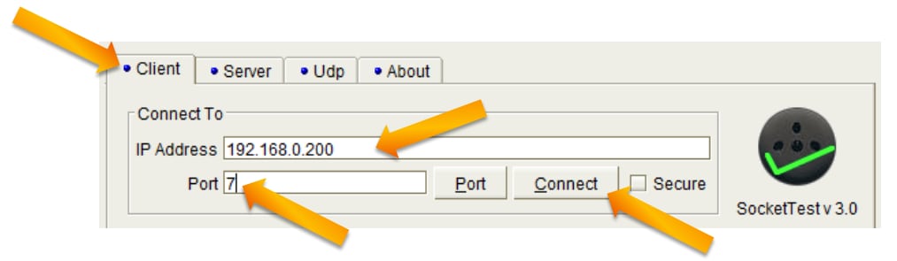 SocketTest(または使用中のTCPクライアント・プログラム)を開き、IPアドレスを192.168.0.200、ポートを7に指定します。