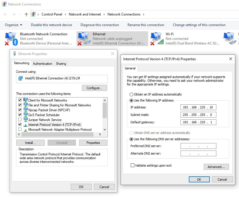 Set the IP address to 192.168.225.xxx, which is the same network segment with S32K344 EMAC(192.168.225.100).