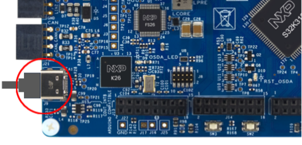 オンボードのS32K3デバッガを使用してデバッグする場合は、J9コネクタにUSB-Cケーブルを接続します。