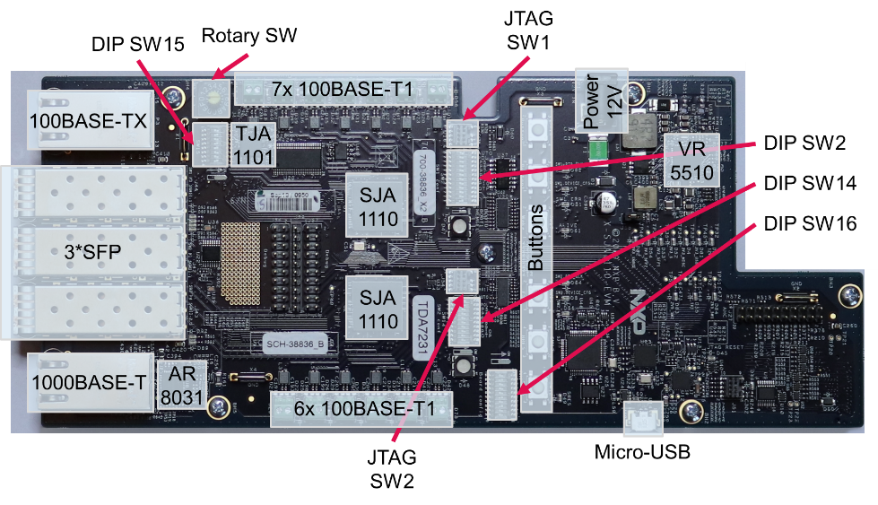 このボードは13個の100BASE-T1 PHYを搭載しており、そのすべてがOPEN Alliance TC10のウェイクアップ・フォワーディング機能に対応しています。さらに、1つのBASE-TX PHYおよび1つの1000BASE-T PHY(ともにRJ45コネクタ付き)、外部マルチギガPHY用の3つの汎用SFPおよびSFP+コネクタも搭載しています。