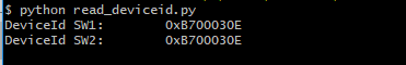 6. SJA1110-EVMのサブフォルダからPythonスクリプトread_deviceid.pyを起動します。このスクリプトは両方のスイッチのデバイスIDを読み取るため、スイッチに到達できるかを確認するために使用できます。以下のメッセージが表示されます。GS-SJA1110-EVM-READ-DEVICEID