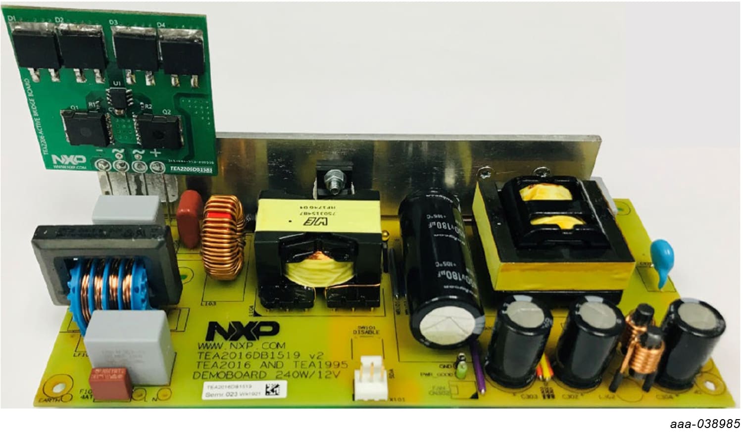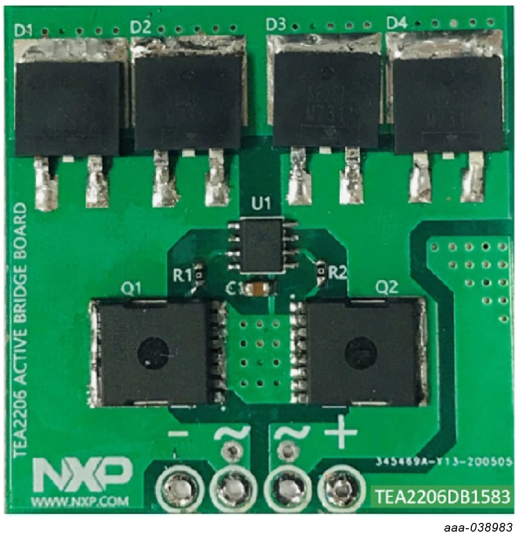 The TEA2206DB1583 demo board consists of the TEA2206T in an SO8 package with two MOSFETs (600 V; 28 mΩ) and four diodes (600 V; 20 A). The following figure shows the front side of demo board.