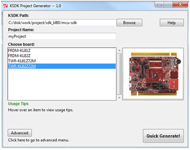 After extracting the zip file, open the utility by clicking the KSDK_Project_Generator executable for your computer's operating system. Point the tool to your SDK installation path, name your project, and select the board that it uses as a reference. Click the Quick Generate button to finish.