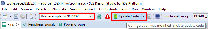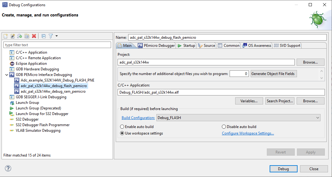 S32 Design Studioのメニューで[Run(実行)]→[Debug Configuration(デバッグ設定)]をクリックし、適切な定義済みのデバッグ設定を選択して[Debug(デバッグ)]をクリックすると、ビルド済みコードのMCUへのロードが開始されます。