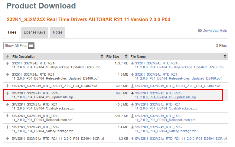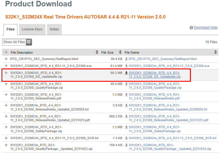 「Automotive SW - S32K1/S32M24x - Real-time Drivers (RTD) for Cortex-M」パッケージを選択し、更新サイト・ファイルをダウンロードします。