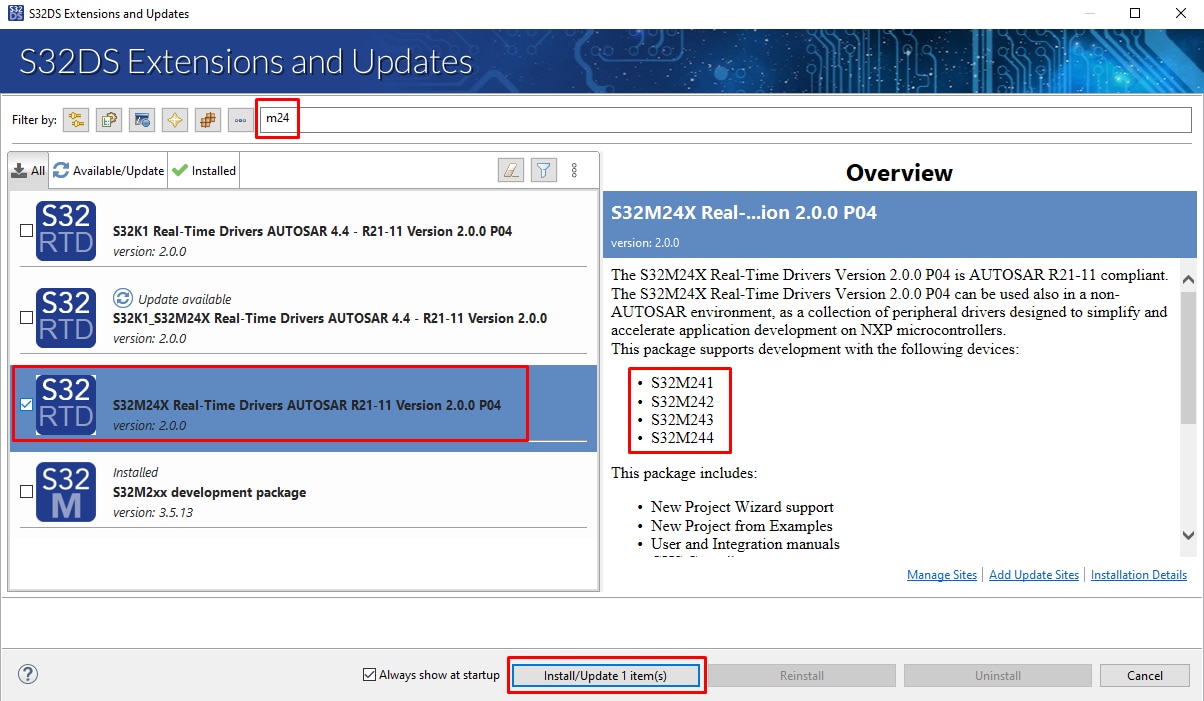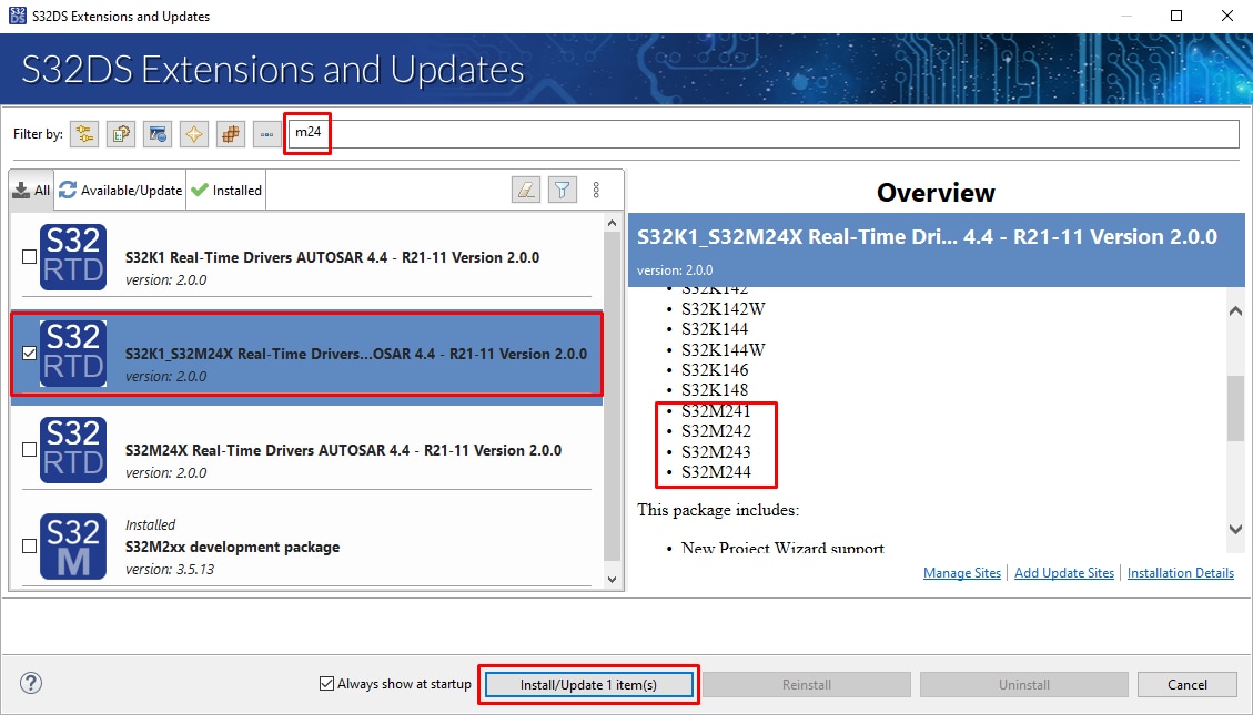 リストからRTD 2.0.0をインストールします。リストにRTD 2.0.0が複数表示されている場合があるため注意してください。必ずS32M24xのみをサポートしているバージョン、またはS32M24xとそれ以外をサポートしているバージョンを選択してください(右側の[Overview(概要)]ウィンドウの内容を確認してください) 。