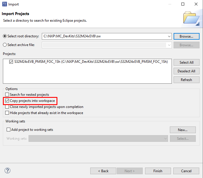 3. インストールされているアプリケーション・ディレクトリNXP\MC_DevKits\S32M24xEVB\swに移動し、適切なプロジェクトを選択したら、[OK]をクリックします。[Finish(完了)]をクリックします GS-S32M24XEVB-IMG23