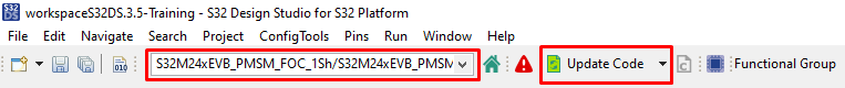 2. 適切なプロジェクトを設定していることを確認し、[Update Code(コードの更新)]ボタンをクリックして設定ファイルを生成します GS-S32M24XEVB-IMG26