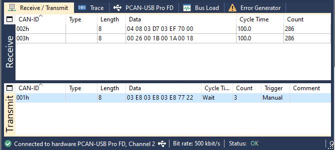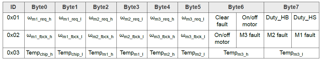 0x01のIDを使用してCAN標準フレームを送信し、モータを起動します。モータの状態はID 0x02と0x03のフレームによってフィードバックされます。
