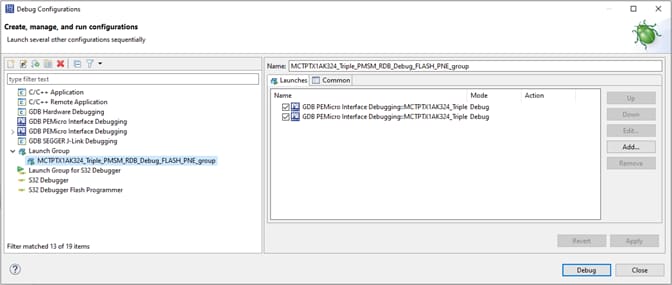 S32 Design Studioのメニューで[Run(実行)]>[Debug Configuration(デバッグ設定)]をクリックし、定義済みのデバッグ設定を選択して[Debug(デバッグ)]をクリックすると、ビルド済みコードのMCUへのロードが開始されます。