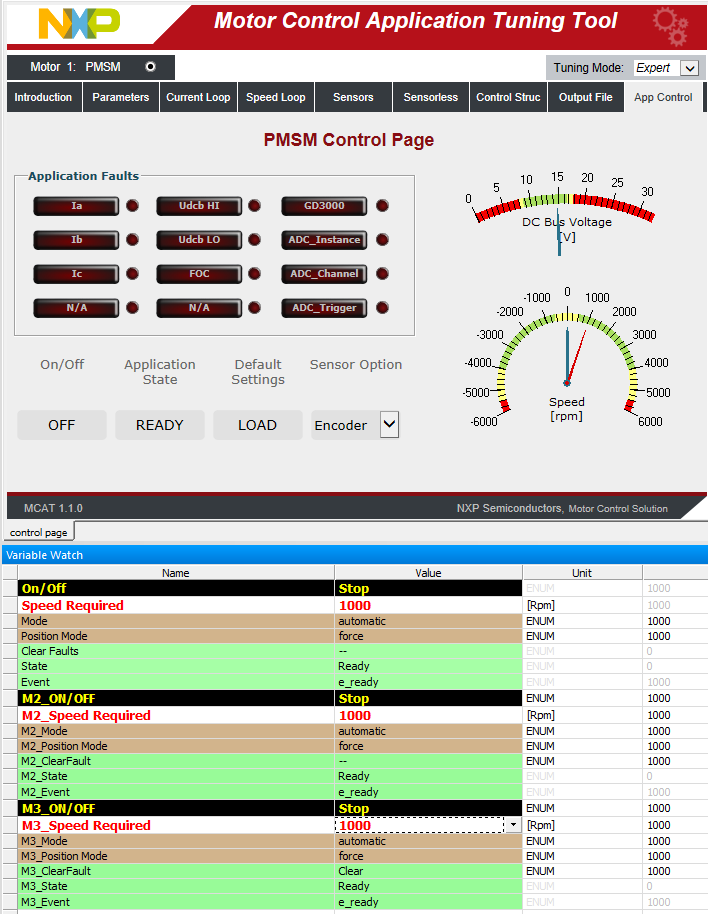 FreeMASTERで[Control page(制御ページ)]タブに進み、必要なモータrpmを設定して、モータ・ドライブをオンにします。