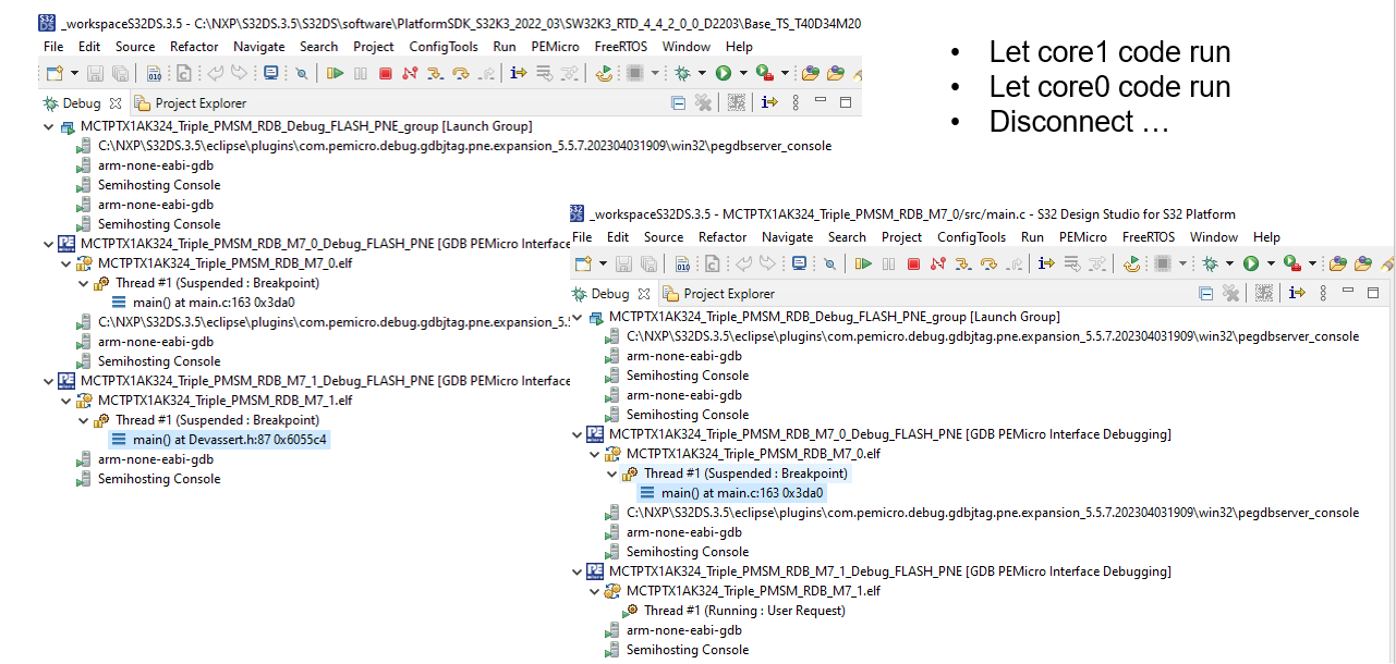 コードがMCUにロードされるとS32DSがデバッグ画面に切り替わるので、[Resume(再開)]をクリックして(またはF8を押して)コードを実行し、[Disconnect(切断)]を使用してS32DS IDEデバッガとFreeMASTERツール間の干渉を回避します。