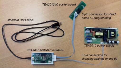 The TEA2016DB1514 interface board is a development tool that enables setting TEA2016 controller parameters from a computer. The available Ringo TEA2016 development software provides a graphical user interface (GUI) that can be installed on a computer.