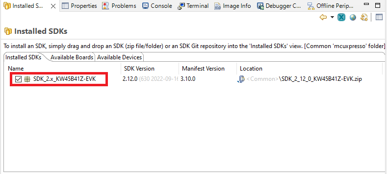 SDKパッケージがダウンロードされたら、MCUXpresso IDEの[Installed SDKs(インストール済みSDK)]ウィンドウにドラッグ&ドロップします。
