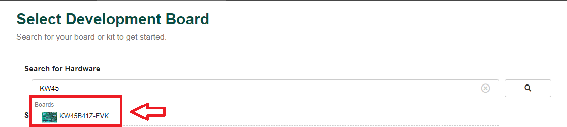 [Search for Hardware(ハードウェアの検索)]検索ボックスに、選択したボード「KW45B41Z-EVK」を入力します。ボードをクリックして選択します。