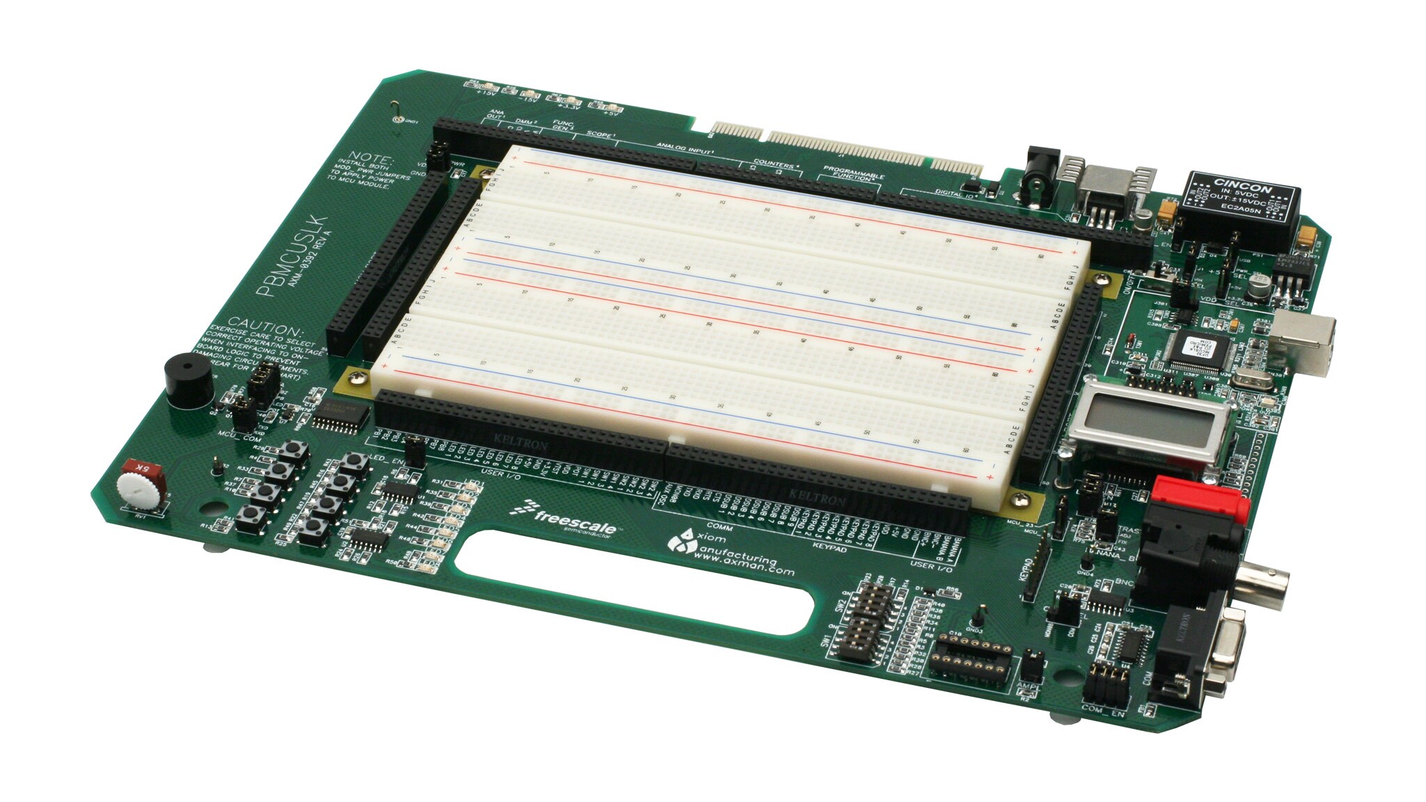 • Large, solderless breadboard area with four power distribution strips