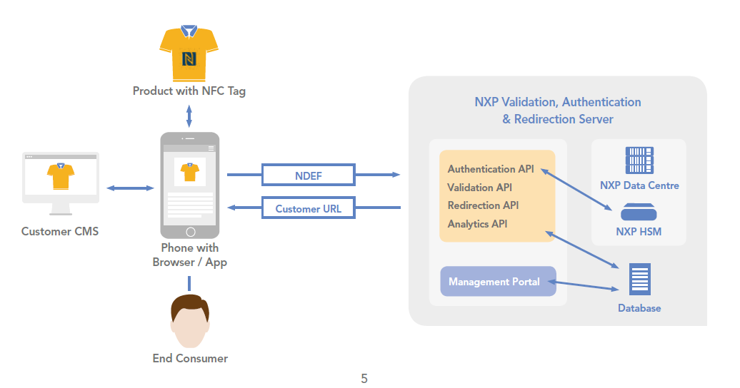 - NFC認証およびリダイレクト・サービスは、タグ管理機能を備えた堅牢な認証エンジンで、安全なFIPS 140-2 Level 3準拠の認証済み環境で暗号化処理を管理します。認証や改ざんなどに基づく高度なルールを備え、異常なタップ動作を検出して是正措置を講じます。本サービスでは、NXPのセキュアなDNA認証製品(NTAG 4xx DNAおよびICODE DNA)をサポートし、SUNのメッセージ認証、タグ認証、相互認証の各方式と暗号化通信に対応します。本サービスは高い柔軟性を備え、リダイレクト・システムとして、またはアプリのバックエンドとしても利用できます。