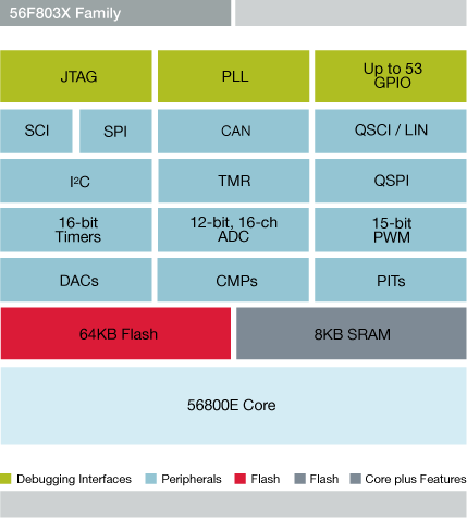 NXP® 56F803X digital signal controllers belong to the 56800E core-based DSC family. It combines digital signal processing and microcontroller functionalities on a single chip, with a flexible set of peripherals.