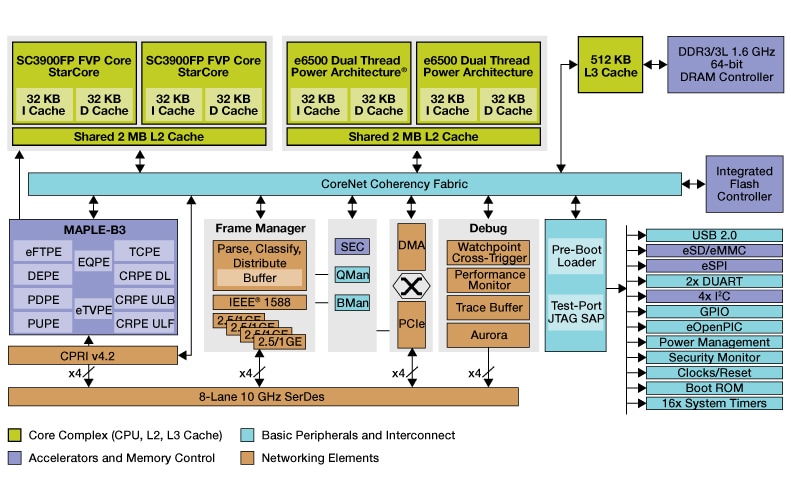 This multicore SoC includes four programmable cores, two 64-bit Power Architecture® cores and two cores based on a StarCore® flexible vector processor (FVP) and high throughput, low latency hardware accelerators for Layer-1, Layer-2 and Transport to enable highly optimized processing for the radio processing chain from PHY to Transport layers.