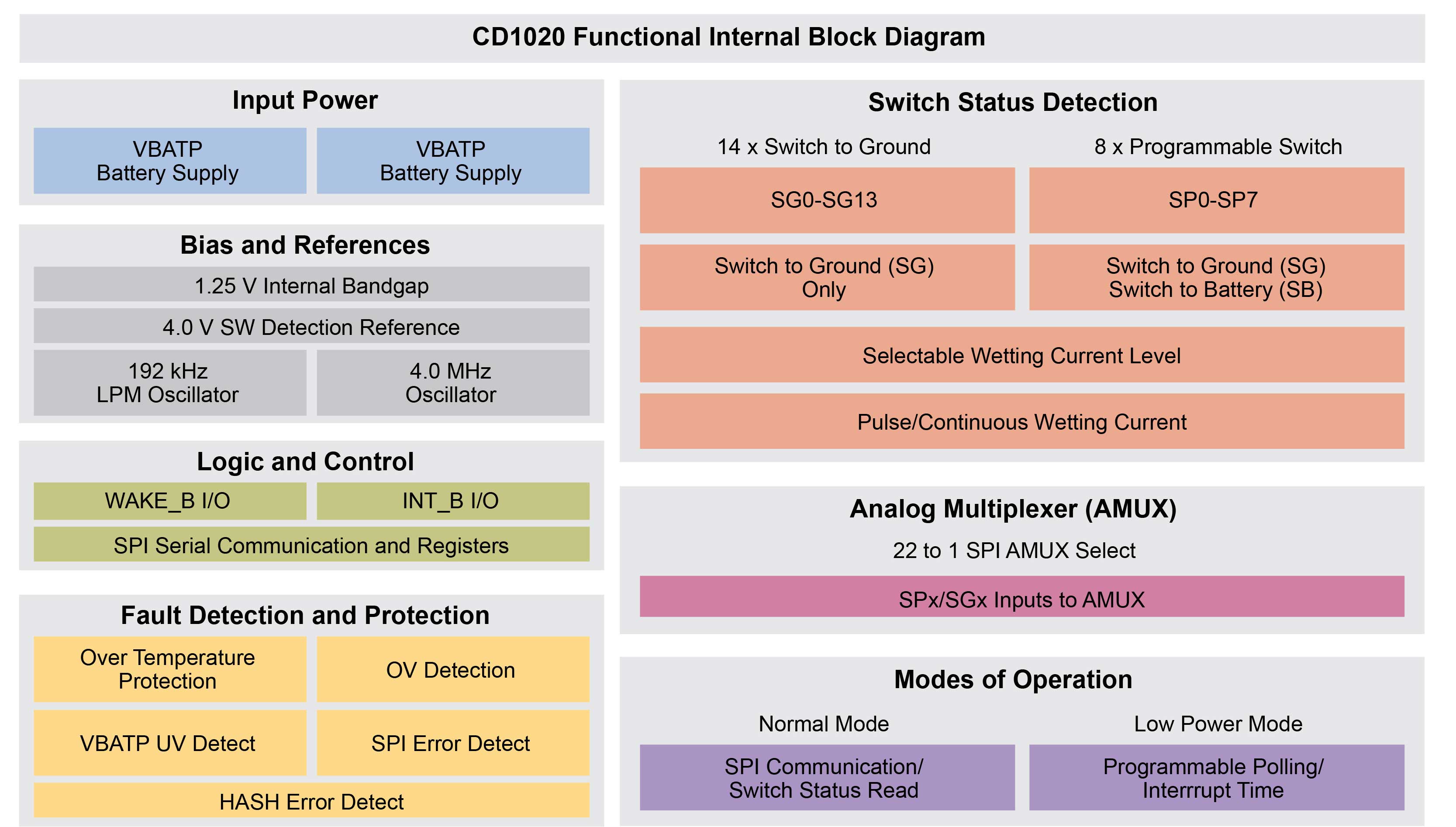 CD1020は、コスト効率に優れたスイッチ検出インターフェース・デバイス (MSDI) です。最大22個のスイッチ接点の開閉を検出します。スイッチの開閉状態に関する情報は、シリアル・ペリフェラル・インターフェース (SPI) を介してマイクロプロセッサ・ユニット (MCU) に送信されます。また、このSMARTMOSデバイスは、22:1のアナログ・マルチプレクサを搭載しており、アナログ入力としての入力チャネルの読み取りに対応します。選択されたアナログ入力信号は、バッファリングされた後、MCUが読み取れるようにAMUXの出力ピンに出力されます。