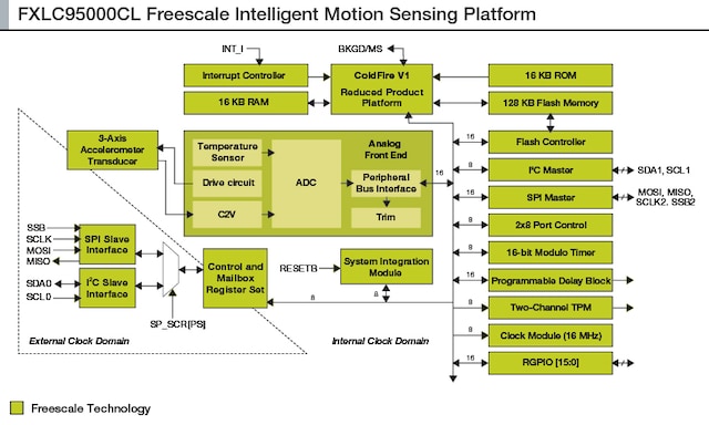 The NXP® FXLC95000CL motion-sensing platform integrates a MEMS accelerometer and a 32-bit ColdFire® MCU, providing autonomous sensing simultaneously with local compute capability to manage other sensors and offer maximum differentiated flexibility.
