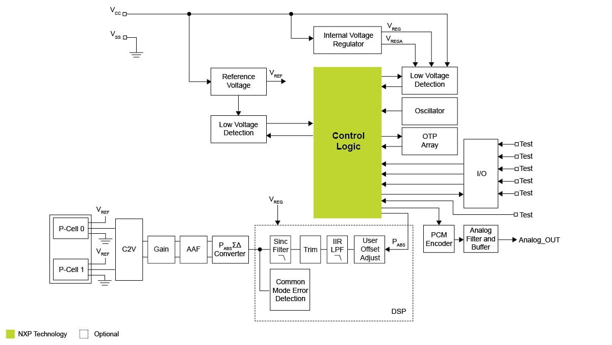 センシング素子は、NXPの高精度静電容量式圧力セル・テクノロジをベースとしています。このアーキテクチャは、品質強化対策として冗長圧力トランスデューサを備えています。3.3 Vまたは5.0 Vの電源で動作しながら、絶対圧のレシオメトリックなアナログ測定値を高精度で提供します。