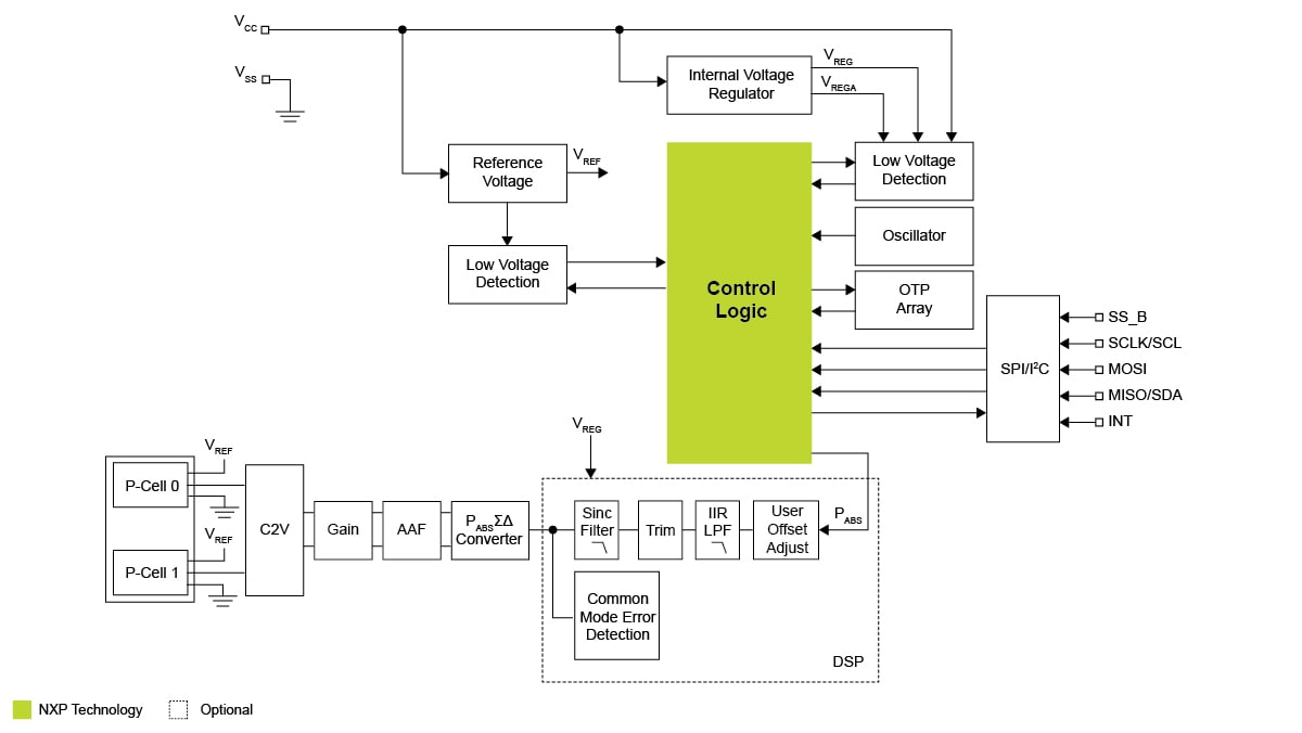 The sensor is based on NXP's high-precision capacitive pressure cell technology. The architecture benefits from redundant pressure transducers as an expanded quality measure. This sensor delivers highly accurate pressure and temperature readings through either a serial peripheral interface (SPI) or an inter-integrated circuit (I²C) interface.
