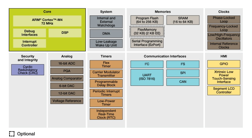 The Kinetis K30 72 MHz Segment LCD MCUs, based on the Arm® Cortex®-M4, offer a scalable entry point into the mid-performance Kinetis portfolio offering high-precision analog integration, flexible low-power and peripheral options. This family shares the comprehensive enablement and scalability of the Kinetis portfolio.