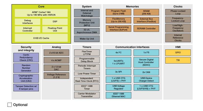 The Kinetis® K65 180MHz IEEE® 1588 Ethernet MCUs are built on the Arm® Cortex® -M4F core and are optimized for applications requiring security encryption, tamper detection, large memory densities and low-power processing efficiency. This family offers a High-Speed USB with integrated HS USB Physical Transceiver, SDRAM Controller, Full Speed Crystal-less USB support, as well as shares the comprehensive enablement and scalability of the Kinetis portfolio.