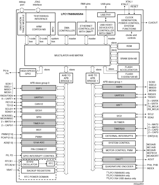 The LPC1765 is a Cortex®-M3 microcontroller for embedded applications featuring a high level of integration and low power consumption at frequencies of 100 MHz. Features include 256 kB of flash memory, 64 kB of data memory, USB Device/Host/OTG, 8-channel DMA controller, 4 UARTs, 2 CAN channels, 3 SSP/SPI, 3 I2C, I2S, 8-channel 12-bit ADC, 10-bit DAC, motor control PWM, Quadrature Encoder interface, 4 general purpose timers, 6-output general purpose PWM, ultra-low power Real-Time Clock with separate battery supply, and up to 70 general purpose I/O pins. The LPC1765 is pin-compatible to the 100-pin LPC2368 Arm7™ MCU