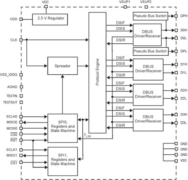 The NXP® MC33781 is a leader device for four differential DSI 2.02 buses that contains the logic to interface the buses to a standard SPI port and the analog circuitry to drive data and power over the bus, as well as receive data from the remote follower devices.