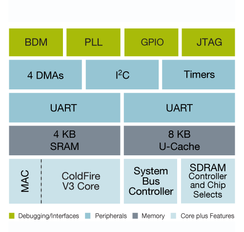 The MCF5307 is a high-performance (70 MIPS), cost-effective, highly integrated microprocessor designed for embedded control applications. The MCF5307 combines a ColdFire® V3; processor core with a multiply-accumulate (MAC) module, DRAM controller, direct memory access (DMA) controller, timers and parallel and serial interfaces. The time required for system design and implementation is greatly reduced by packaging common system functions on-chip and providing glueless interfaces to 8- 16- and 32-bit DRAM, SRAM, ROM and I/O devices.