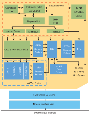 The MPC7448 includes the same powerful 128-bit AltiVec vector execution unit as found in previous MPC74xx devices, but with the enhanced support for out-of-order instructions. AltiVec technology may dramatically enhance the performance of applications such as voice over IP, speech recognition, multi-channel modems, virtual private network servers, high-resolution 3D graphics, motion video (MPEG®2, MPEG4), high fidelity audio (3D audio, AC-3), and so on.