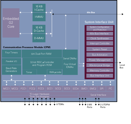 Our leading PowerQUICC architecture integrates two processing blocks. One block is a high-performance embedded G2 core and the second block is the Communications Processor Module (CPM). The CPM of the PowerQUICC II processor can support up to three fast serial communications controllers (FCCs), two multichannel controllers (MCCs), four serial communications controllers (SCCs), two serial management controllers (SMCs), one serial peripheral interface (SPI) and one I²C interface. The combination of the G2 core and the CPM, along with the versatility and performance of the PowerQUICC II processor family, provides customers with enormous potential in developing networking and communications products while significantly reducing time-to-market development stages.