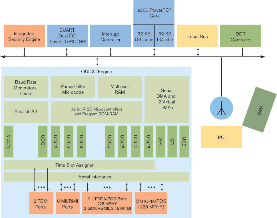 NXP® Semiconductors's MPC8360E PowerQUICC® II™ Pro family of integrated communications processors is a next-generation extension of the popular PowerQUICC II line containing cores built on Power Architecture technology. The MPC8360E family incorporates a next-generation communications engine, the QUICC™ Engine, supporting a wide range of protocols, including Gigabit Ethernet and OC-12 asynchronous transfer mode (ATM)/Packet over Sonet (POS). Additional enhancements include the e300 core (enhanced version of the 603e™ core with larger caches), scaling up to 667 MHz, a DDR memory controller and the integrated security engine.