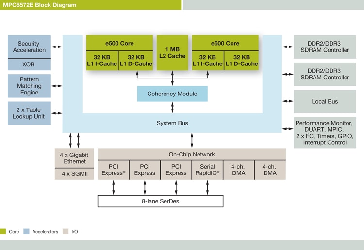 The MPC8572E family of processors offers clock speeds from 1.2 GHz up to 1.5 GHz, combining two powerful e500 processor cores built on Power Architecture® technology, enhanced peripherals and high-speed interconnect technology to balance processor performance with I/O system throughput. These processors also contain application acceleration blocks such as a table lookup unit (TLU) that offloads complex table searches and header inspections, a pattern-matching engine to handle regular expression matching with a deflate engine to manage file decompression and a security engine that accelerates crypto operations in IPsec and SSL/TLS for VPNs.