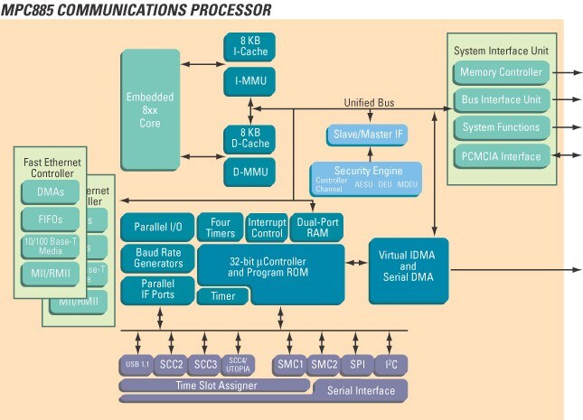 The MPC885 Family includes the MPC870, MPC875, MPC880 and MPC885 processors. These highly integrated PowerQUICC devices are designed to deliver a versatile, single-chip communications processor and peripheral solution that can be used in a variety of controller applications, excelling particularly in communications and networking products. Ideal applications include low-end routers, VPN routers with integrated security features, home networking equipment, cost-effective WLAN access points and xDSL gateway boxes.