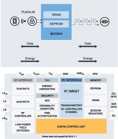 NCx3310は、車載ユース・ケース向けのI²Cリーダ/フォロワとして構成可能な有線ホスト・インターフェースを備え、コスト効率の高いNFCインターフェースの実装を可能にします。この製品はNFCフォーラム準拠の非接触タグで、NFC対応の近距離デバイスおよびISO/IEC 15693対応の産業向け長距離リーダーでの読み取りや書き込みが可能です。
