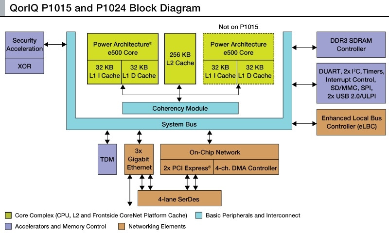 The QorIQ® P1 family, which includes the P1015 and P1024 communications processors, offers extensive integration and extreme power for a wide variety of applications in the networking, telecom, defense and industrial markets. Based on 45 nm technology for low-power implementation, the P1015 and P1024 processors provide single- and dual-core solutions for the 400 MHz to 667 MHz performance range, along with advanced security and a rich set of interfaces.