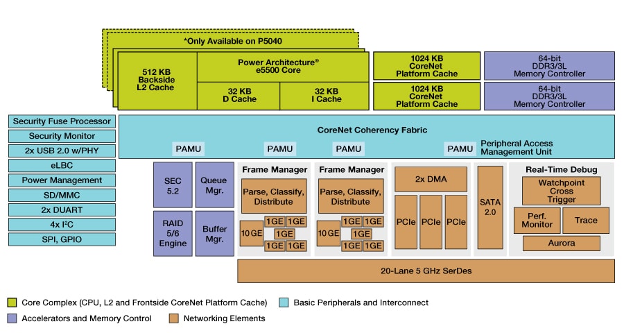 The QorIQ® P5 family delivers scalable, 64-bit processing with single-, dual-, and quad-core devices. With frequencies scaling up to 2.2 GHz, a tightly coupled cache hierarchy for low latency, and integrated hardware acceleration, the P5040 (quad-core) and P5021 (dual-core) devices are ideally suited for compute-intensive, power-conscious control plane applications.