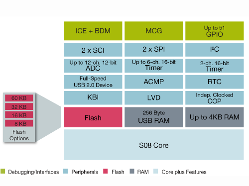 The S08JM family extends NXP’s entry-level USB portfolio. Featuring on-chip USB 2.0 full-speed device support, it provides a fast, economical and easy way to standardize serial communications in industrial and consumer applications. All MCUs in the S08JM family use the enhanced S08 core. Additionally, NXP® provides two complimentary USB software stacks to help designers simplify applications with USB functionality: USB-LITE Stack by CMX and the USB-MINI Stack by NXP.