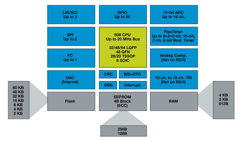 The automotive S08RN Family of 8-Bit MCUs is highly scalable, ranging from simple devices with 2kB Flash in 8-pin-packages for cost-effective solutions to feature-rich derivatives with 60kB Flash in 64-pin packages. The family-approach allows easy, pin and peripheral-compatible migration.