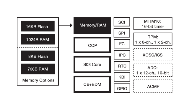 The 8-bit MC9S08SV16/8 (SV16/8) family of microcontrollers (MCUs) with enhanced performance, system reliability and design flexibility to meet the tough design requirements of industrial applications. The S08SV family increases design flexibility with 30 GPIO pins and simplifies software design through an interrupt priority controller with nested interrupt capability.